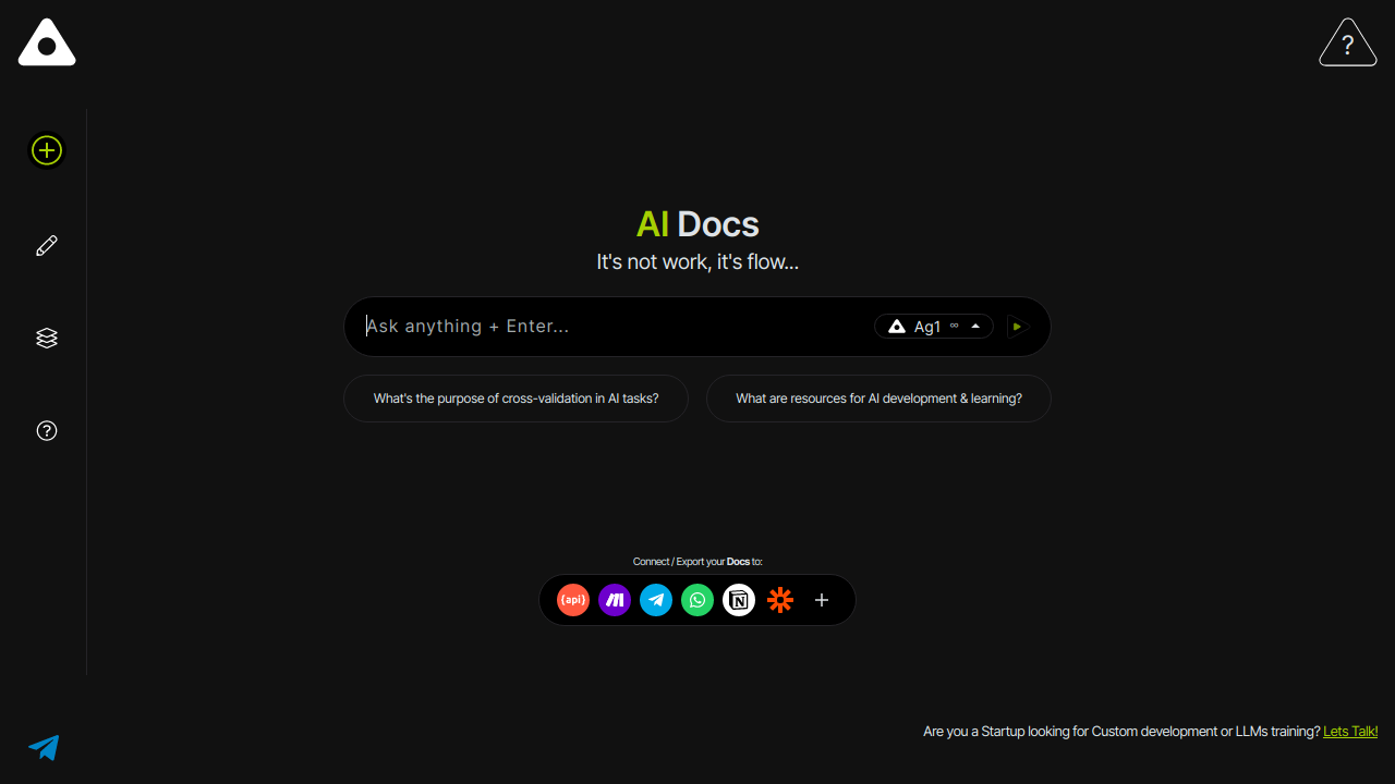 AI Docs bietet eine Plattform zur Erstellung und Implementierung von trainierten Large Language Models für Automatisierungen in verschiedenen Formaten, einschließlich APIs und Chatbots für Telegram und WhatsApp, mit einer umfassenden Echtzeit-Webdatenintegration ohne Beschränkung der Kontextlänge.