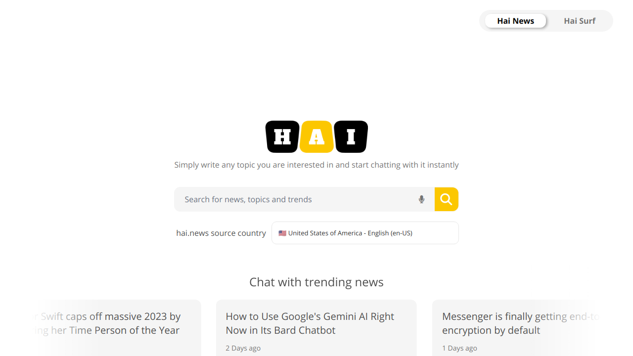 Hai News ist ein fortschrittliches, KI-gesteuertes Nachrichteninteraktionstool, das die Art und Weise, wie wir Nachrichteninhalte abrufen und interagieren, durch Chat-Funktionen und eine leistungsstarke Suchfunktion für weltweit führende Medienquellen revolutioniert.